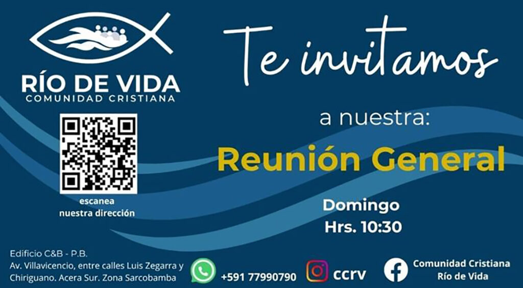 Si vives en la ciudad de Cochabamba – BOLIVIA, o planeas visitarla, y buscas formar parte de una Iglesia donde puedas desarrollar tu relación personal con Dios y aprender más del propósito divino para tu vida de acuerdo a la Biblia, queremos invitarte de nuestras reuniones generales, somos la COMUNIDAD CRISTIANA RÍO DE VIDA (C.C.R.V.)